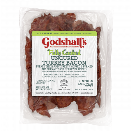 Crafted from U.S.-raised turkey and naturally smoked with real hardwoods, Godshall’s Fully Cooked Uncured Turkey Bacon offers foodservice operators a clean, flavorful, and convenient bacon alternative. With just seven simple ingredients and no artificial flavors or preservatives, it delivers rich, smoky taste and crispy texture—ready in just seconds.