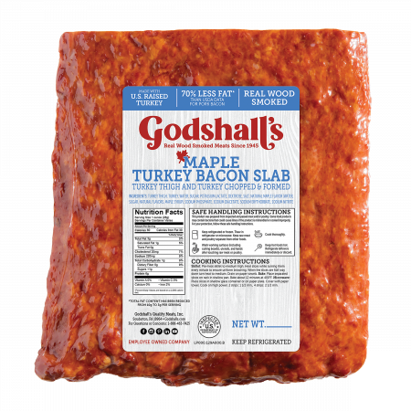 Made from premium whole cuts of U.S.-raised turkey, naturally smoked with real hardwood and infused with sweet maple syrup for a rich, unique flavor. This turkey bacon slab provides food service professionals a versatile, lean protein option perfect for breakfast menus, sandwiches, and catering. Gluten-free and without artificial flavors, it offers consistent quality and a delicious balance of savory and sweet to enhance any dish.